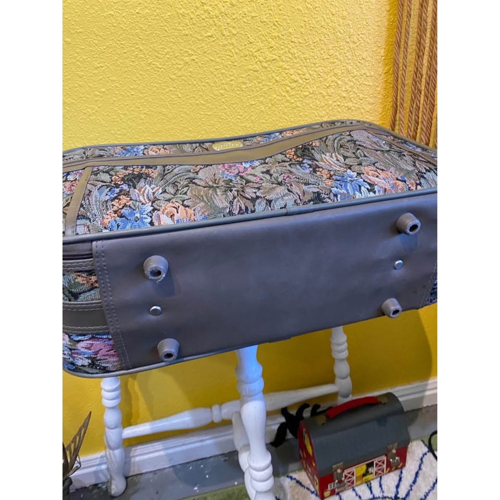 Jordache floral tapestry carry on luggage. Vintage travel suitcase