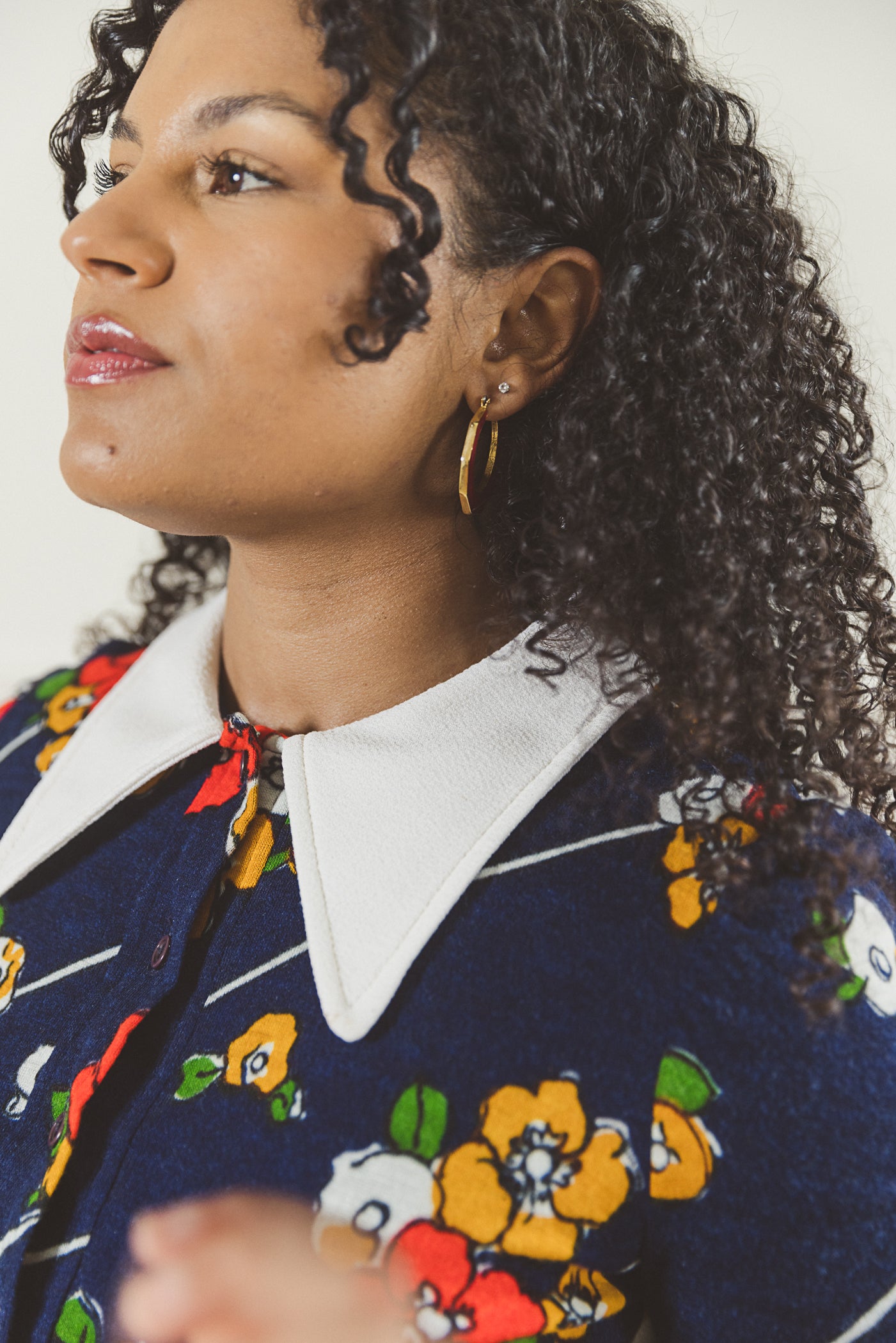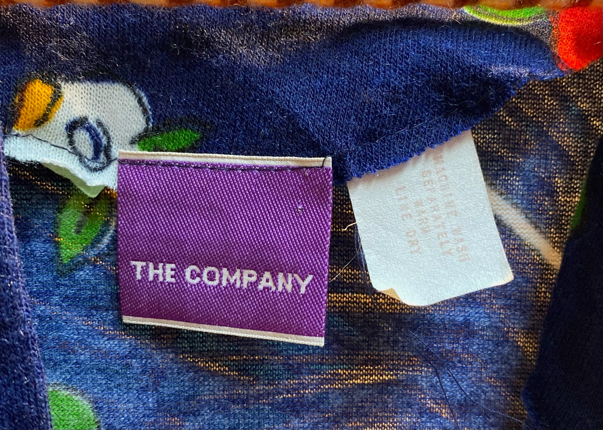 Bright colorful flowers throughout. Please see close ups- small pinhole in left breast area, slight discoloration on tip of collar-rust? Stretchy, thin material. 8 buttons up the front with tie waist. Please refer to measurements for desired fit.