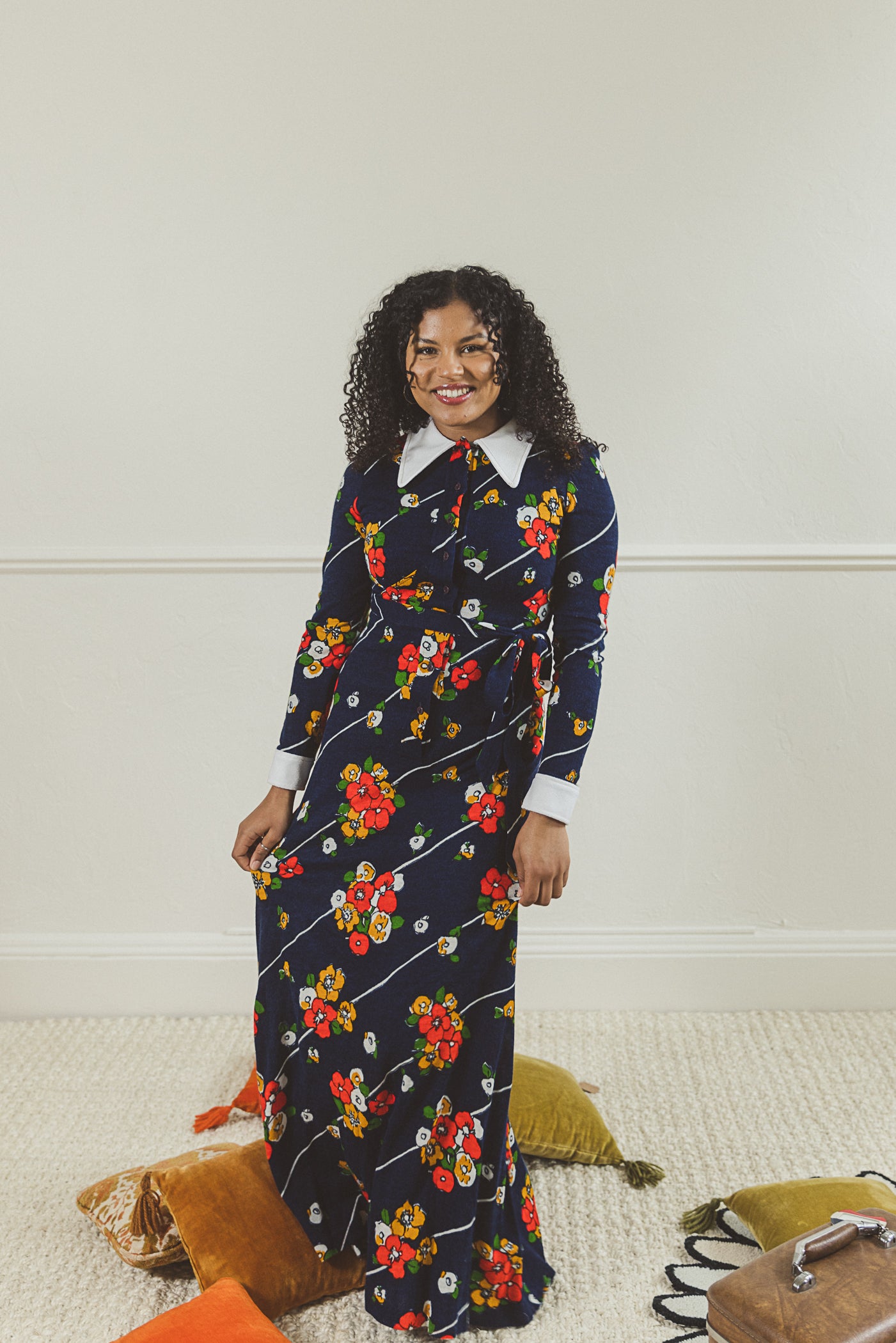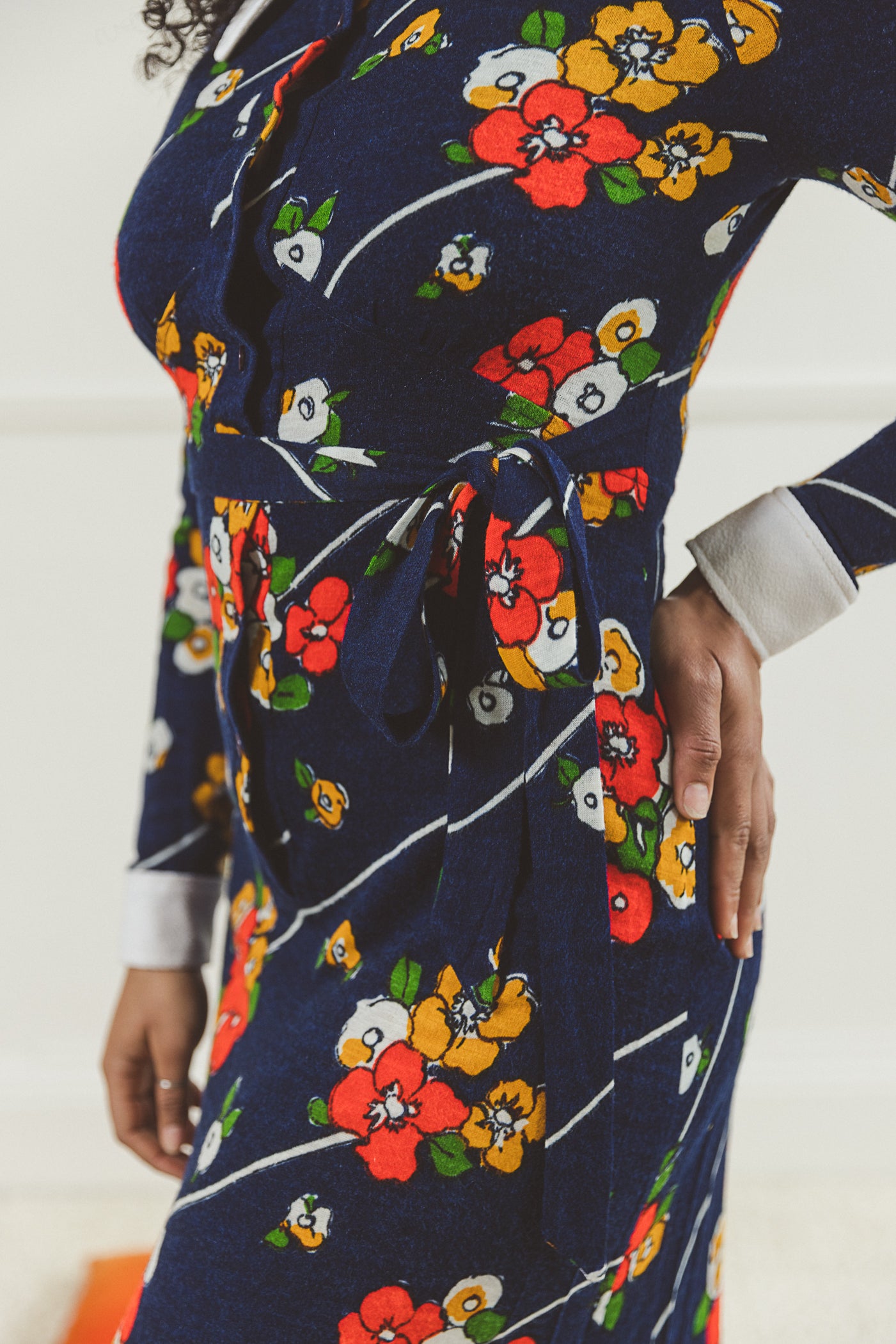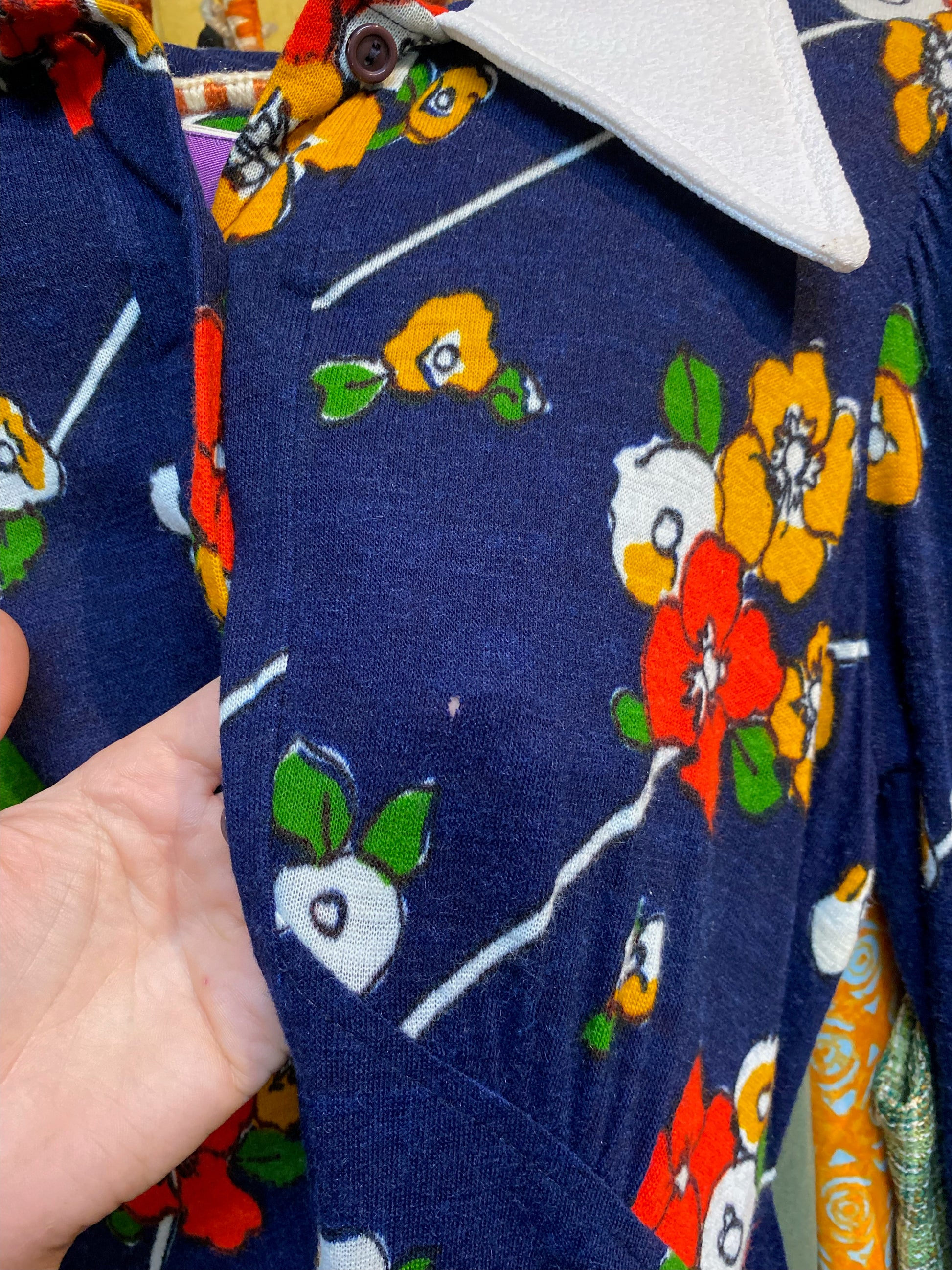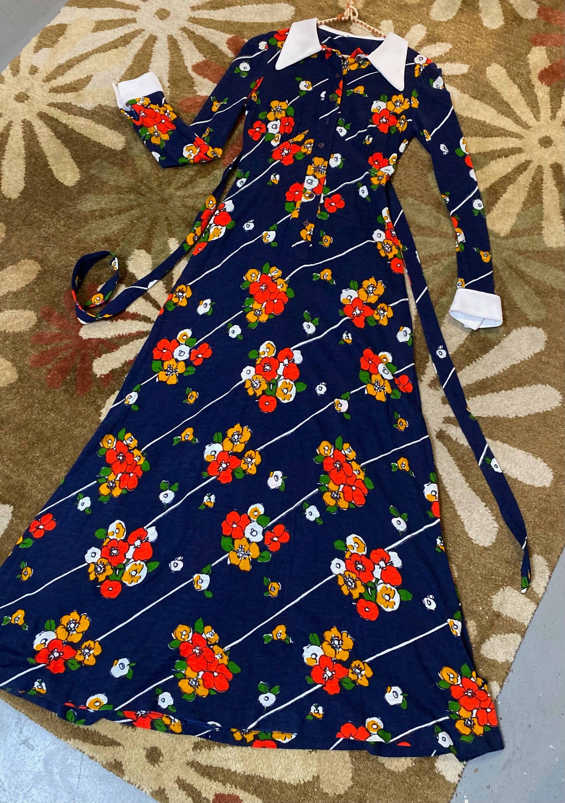 Vintage 70s Flower Power Navy Blue Long Sleeve Maxi Dress White Collar Detail