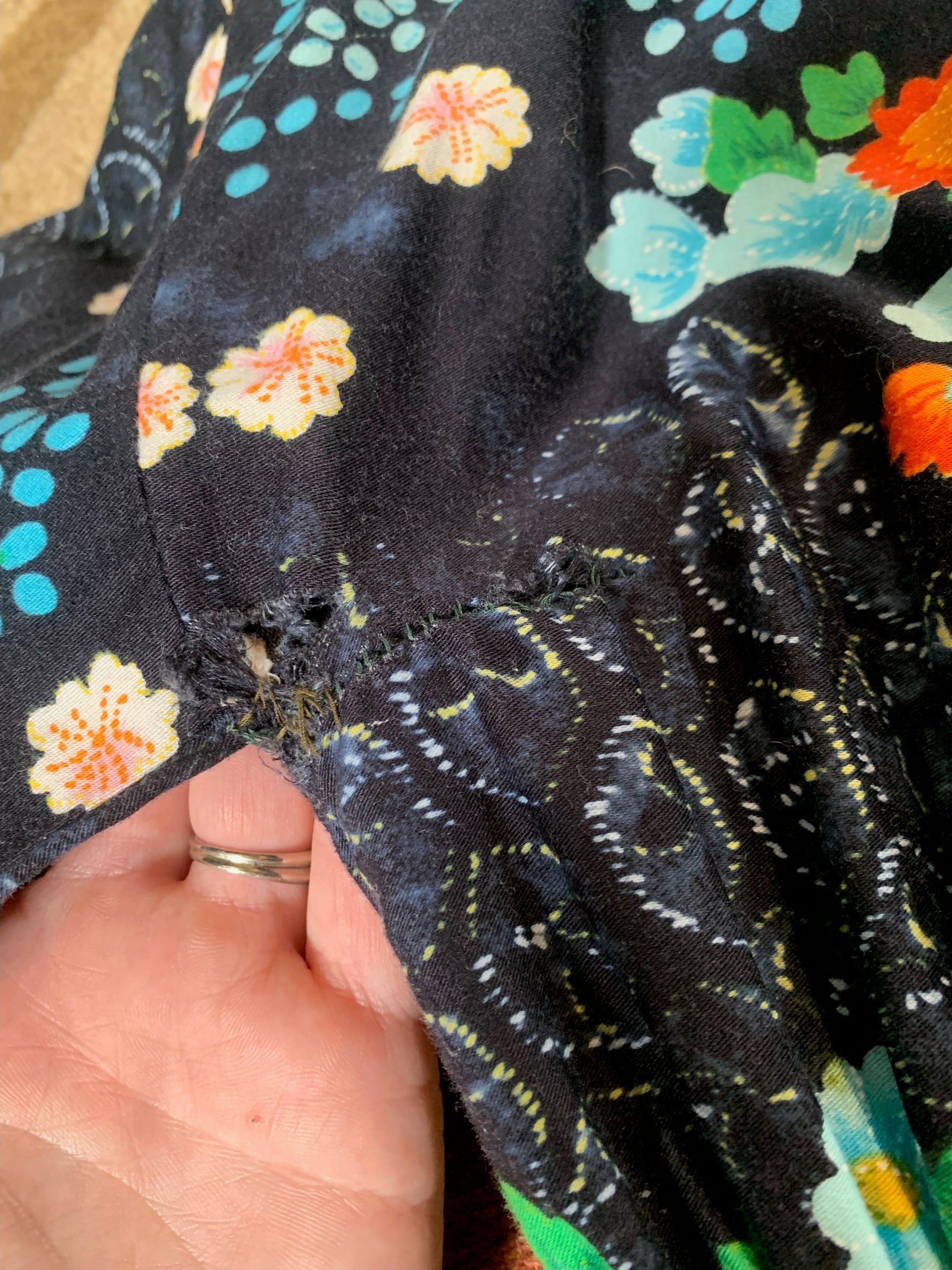 Who is tripping to Hawaii soon? This piece is sold 'as is' please see up close pictures to repaired right underarm stitching/ left side has loose stitching/small hole as well. Beautiful color combination with bright orange and deep blue floral pattern. Three orange knotted details up the front with great kimono like sleeves. Stretch/elastic waist. Please refer to measurements for desired fit.